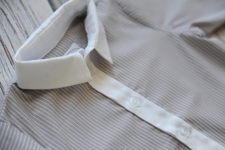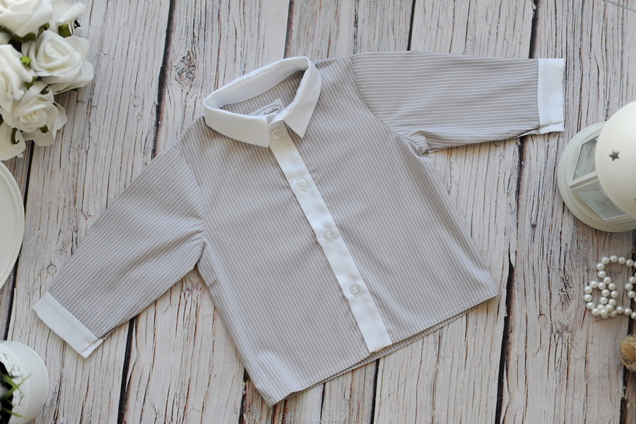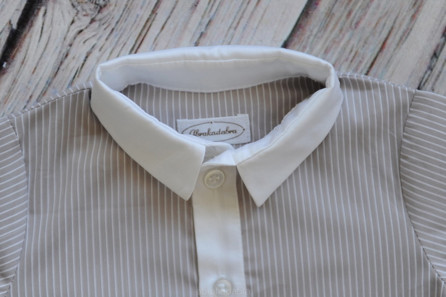 Camasuta bej din bumbac moale cu dungi albe, guler si mansete albe.