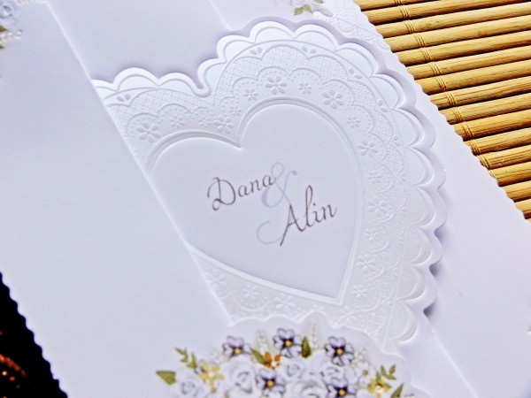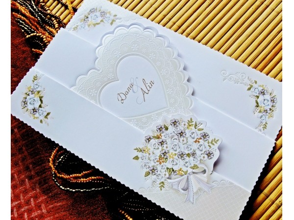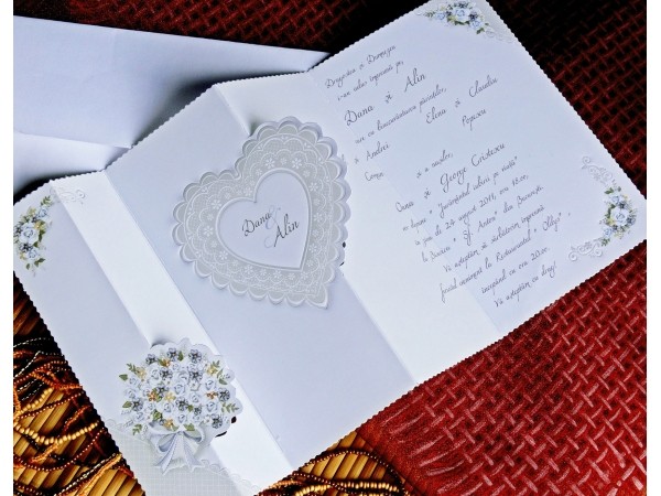 Invitatie de nunta confectionata dintr-un carton ce se pliaza pe verticala , textul scriindu-se pe partea dreapta. In inimioara se vor scrie numele sau initialele mirilor.