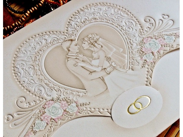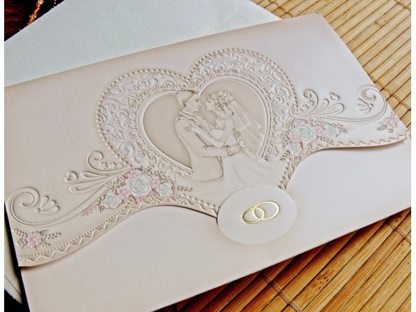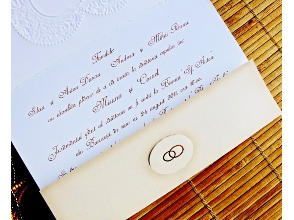 Invitatie de nunta confectionata dintr-un carton lucios destinat textului, ce se pliaza in trei pe verticala.