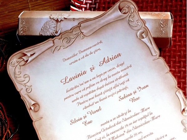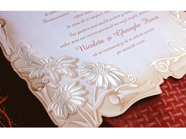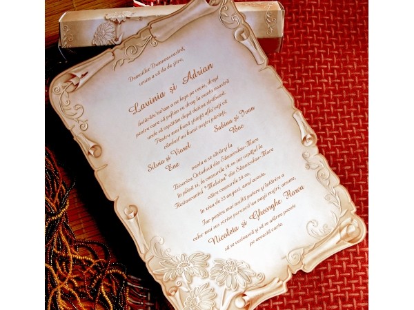 Invitatie din carton alb sub forma unui pergment care are marginile maronii pe care sunt imprimate motive florale in relief, iar central este tiparit textul. Marginile sunt decupate neuniform.