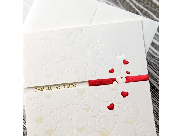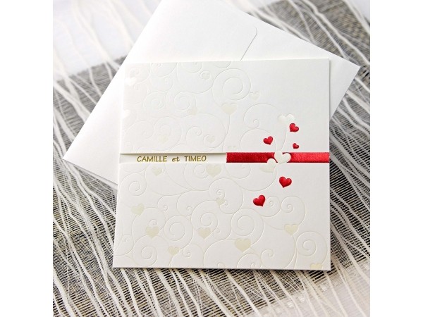 Invitatie de nunta moderna, realizata dintr-un cartonas ce se pliaza in doua parti egale pe orizontala. Coperta este decorata inimioare colorate.