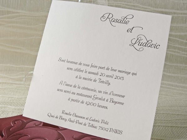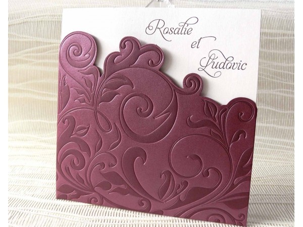 Invitatie de nunta mov sidefat, realizata cu un model embosat. Plicul este alb, mat.
