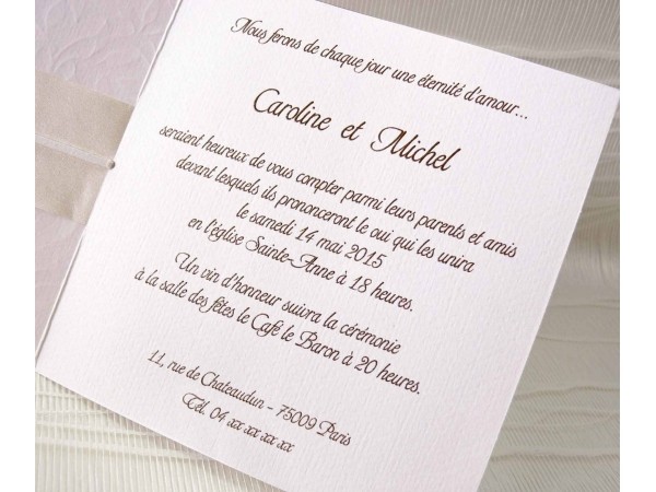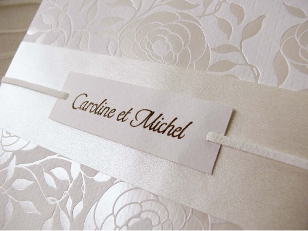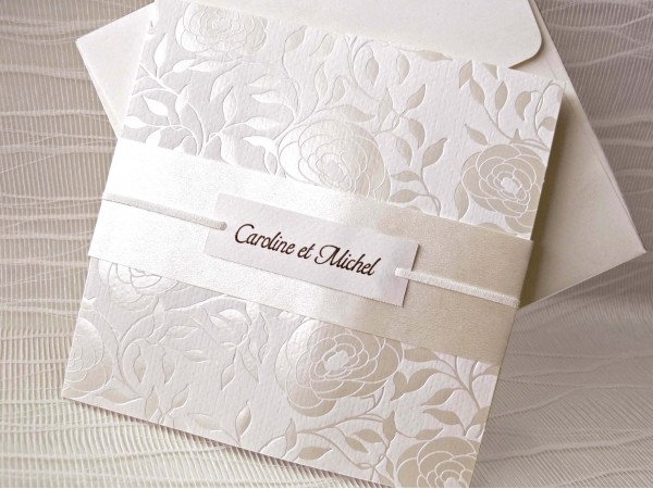 Invitatii de nunta confectionate dintr-un carton mat ce se pliaza in doua, pe verticala.Invitatia este decorata in exterior, cu un imprimeu floral sidefat, in relief.