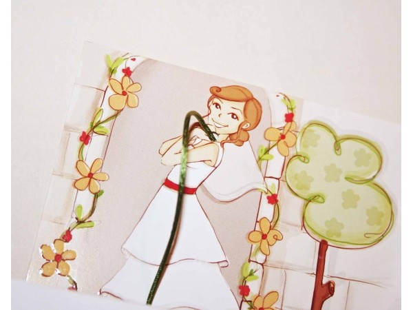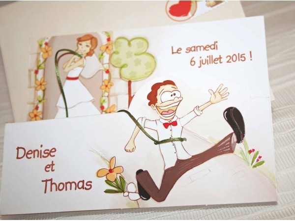 Invitatie de nunta cu miri haiosi ce se pliaza in trei si este accesorizata cu un snur verde.