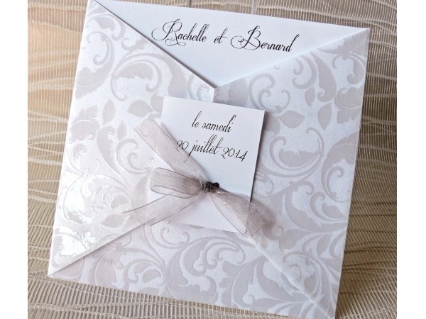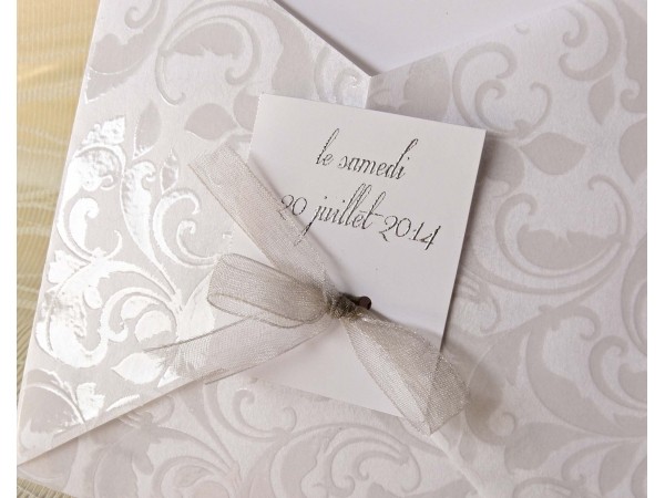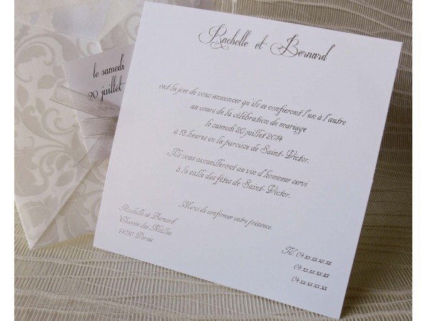 Invitatie de nunta eleganta, formata din interior de carton destinat tiparirii si exterior de calc accesorizat cu fundita de organza.