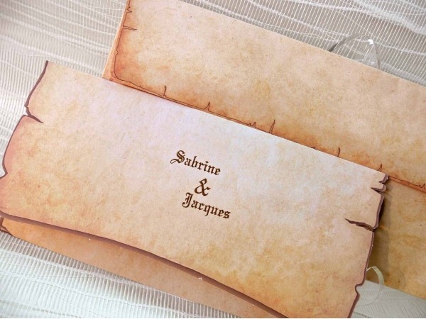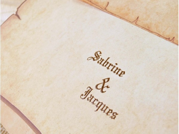 Invitatie de nunta realizata in nuante de maro, ce se pliaza in trei. Plicul este realizat in ton cu invitatia.