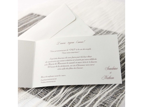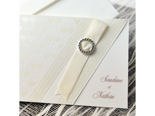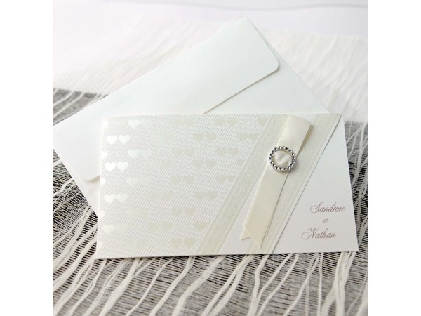 Invitatie de nunta realizata dintr-un cartonas alb ce se pliaza in doua parti pe orizontala si se accesorizeaza cu o fundita si inel cu pietricele.