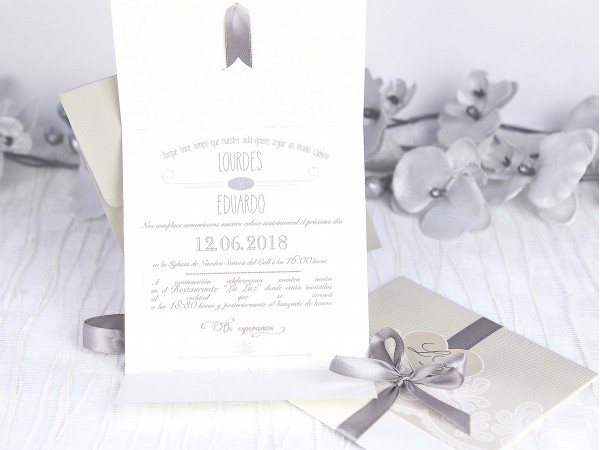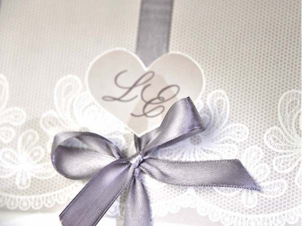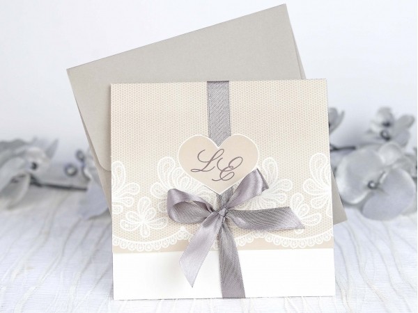 Invitatie eleganta cu dantela imprimata pe clapa superioara. Inimioara centrala permite imprimarea initialelor mirilor si este decorata cu panglica gri-rose satinata.