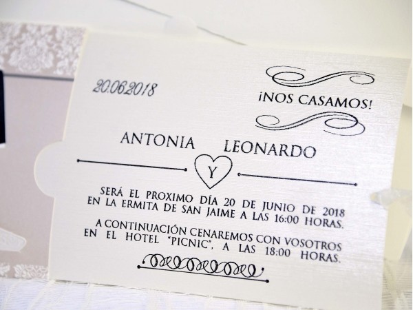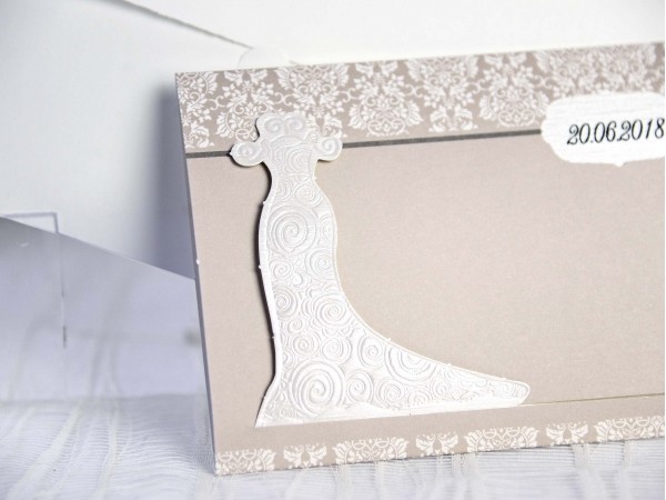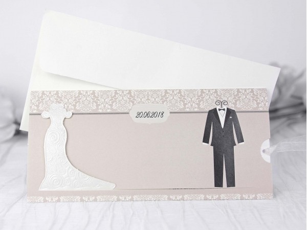 Invitatie de nunta tip costum mire si mireasa. Decupajul din teaca permite vizualizarea datei evenimentului. Motive florale imbogatesc decorul acestei invitatii. Cartonul interior, destinat tiparirii textului, este texturat. Accesoriu: panglica organza alba.