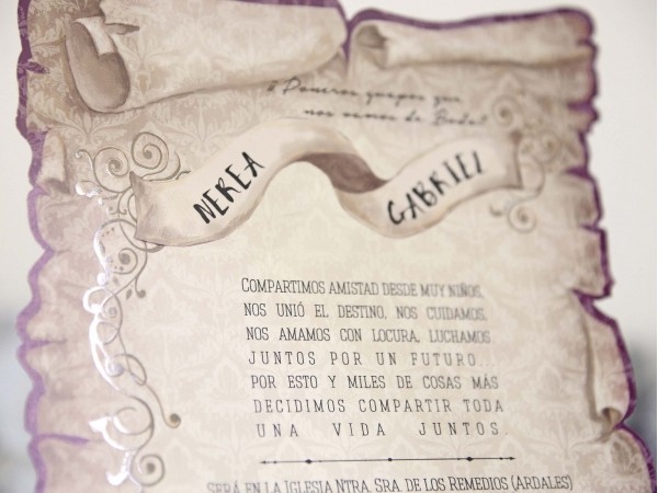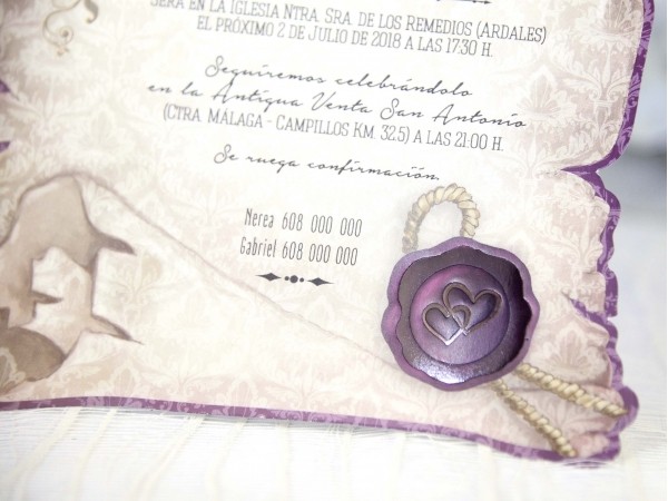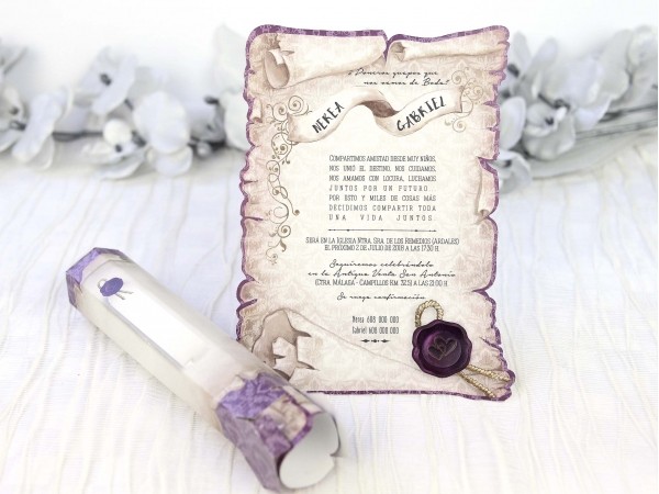 Invitatie tip papirus. Stil vintage, aceasta invitatie se introduce intr-o cutie hexagonala cu decoratiuni mov.