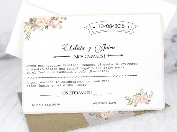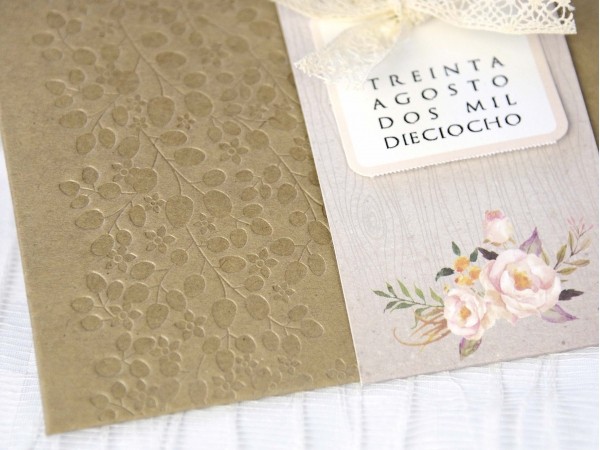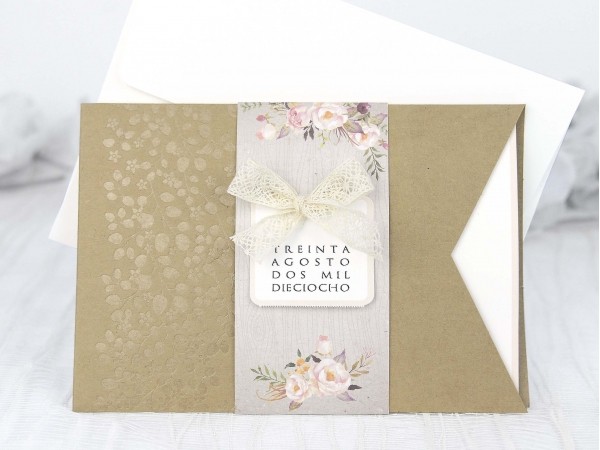 Invitatie cu teaca. Motive florale sunt tiparite cu folio transparent pe partea stanga. Biletelul exterior ofera posibilitatea de a imprima data evenimentului. Textul este tiparit pe un carton alb ce se introduce in teaca. Accesoriu invitatie: fundita macrame.