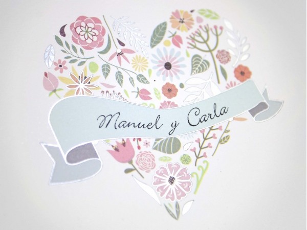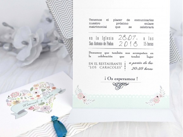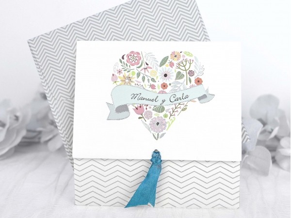 Invitatie moderna ce se deschide pe verticala. Clapa superioara este decorata cu o inimioara din flori si o panglica tiparita ce se poate personaliza cu numele mirilor. Zig-zag-urile de pe clapa de jos sunt imprimate cu relief argintiu. Textul este tiparit pe interior, parte centrala.