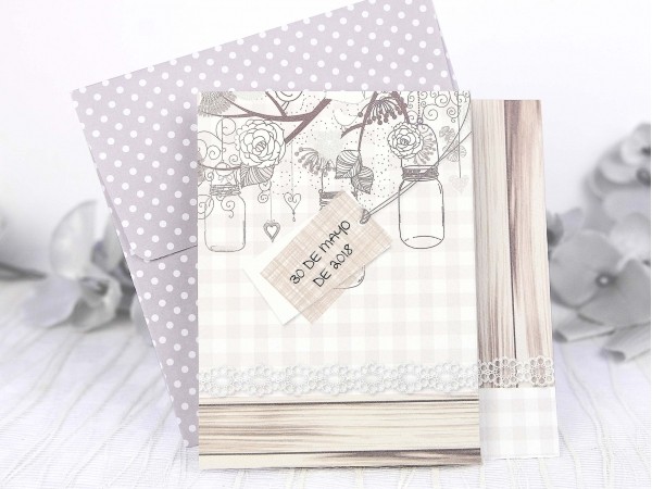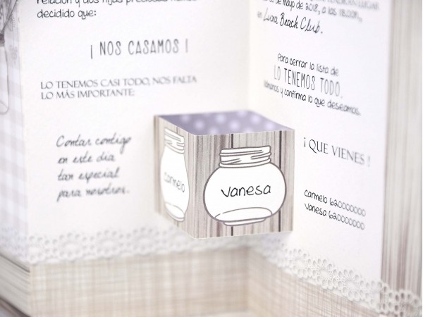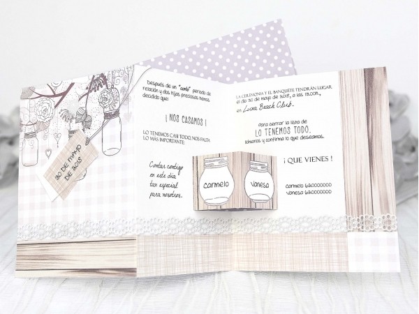 Invitatie triptica cu aspect rustic. Invitatia are un decupaj interior pe care se scrie numele mirilor si se deschide in 3D. Pentru un plus de eleganta, pe anumite elemente este aplicat folio crem.