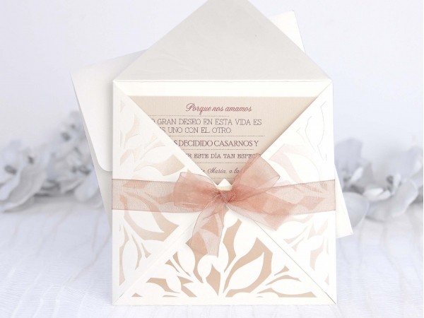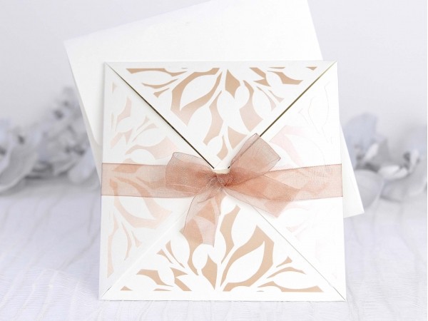 Invitatie tip plic cu clape. Motivele vegetale imprimate cu folio crem de pe clape definesc invitatia.