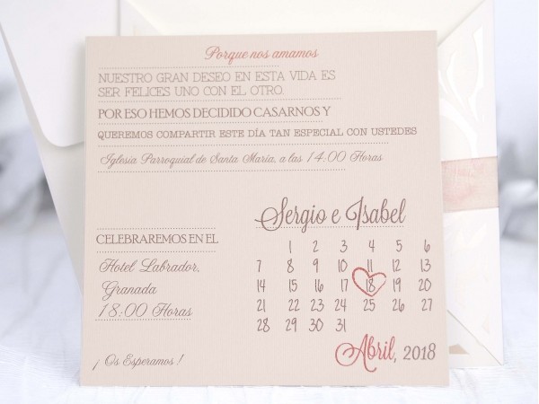 Textul tip calendar se imprima pe un carton crem. Data nuntii este incercuita de o inimioara.