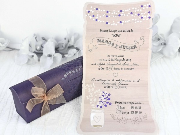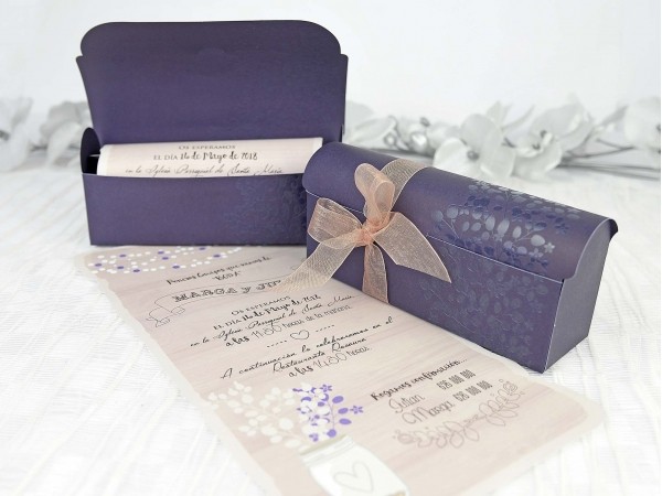 Invitatie tip papirus. Aceasta se introduce intr-un cufar bleumarin decorat cu motive florale imprimate cu folio crem. Panglica organza aramie da un plus de eleganta.
