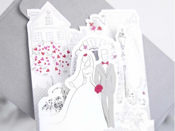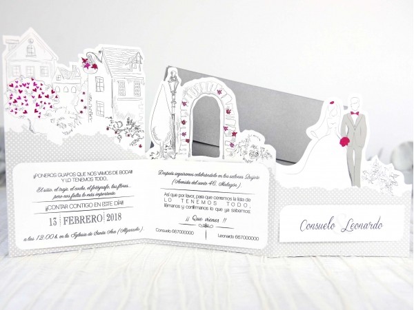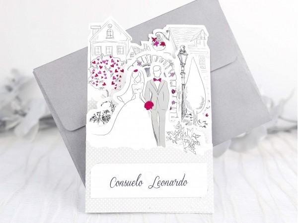 Invitatie pentru o nunta ca in povesti! Invitatia se deschide pe orizontala si prezinta mirii intr-un decor de poveste cu o gradina special amenajata pentru aceasta zi speciala.