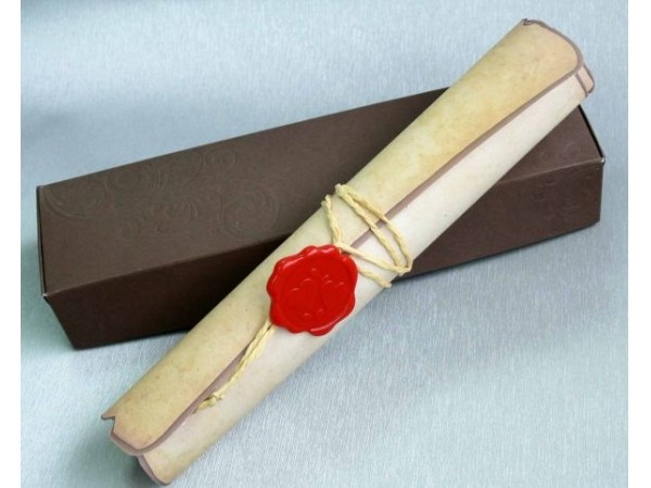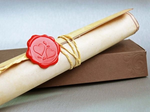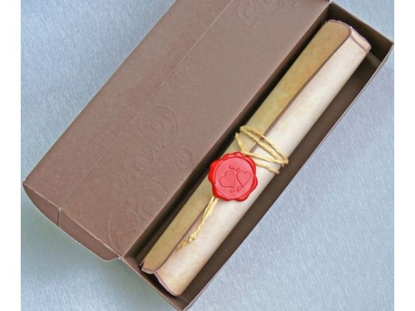 Invitatie de nunta tip pergament, ce se ruleaza si se prinde cu un snur, la care se adauga o pecete.