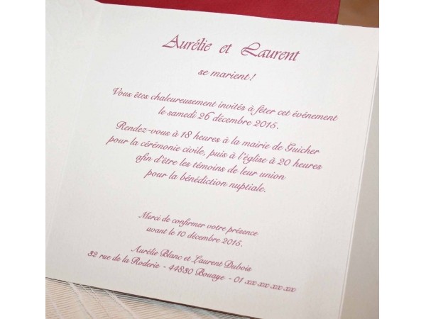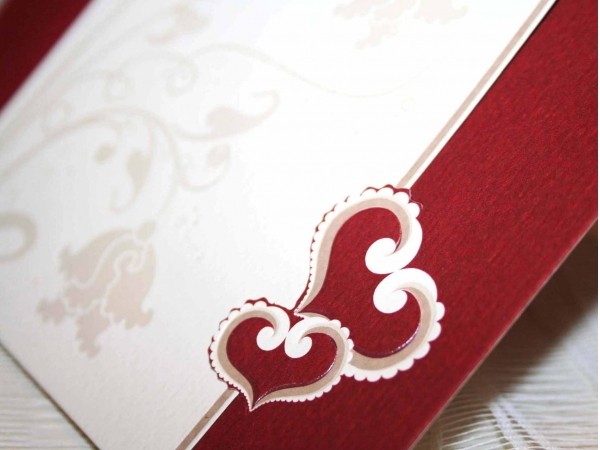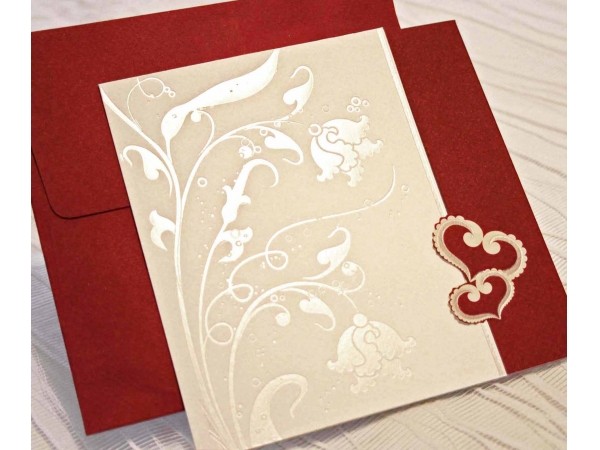 Invitatie de nunta realizata din carton mat de culoare crem si grena cu motive embosate si 2 inimioare decupate.