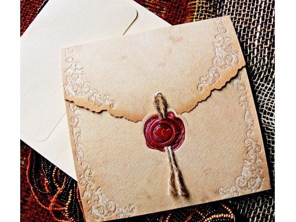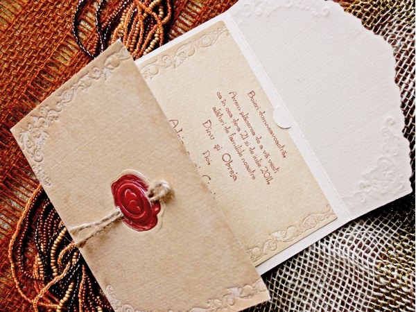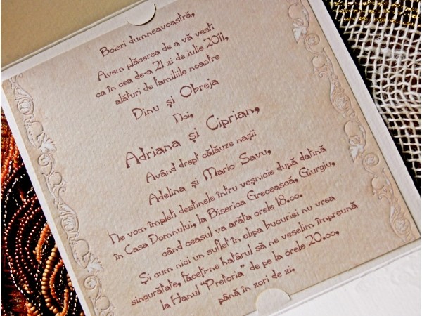 Invitatie din carton bej, pe marginile careia sunt motive florale in relief de un crem mai deschis, indoita sub forma unui plic a carui capac se inchide cu un buton format dintr-un sigiliu in care sunt doua inimioare.