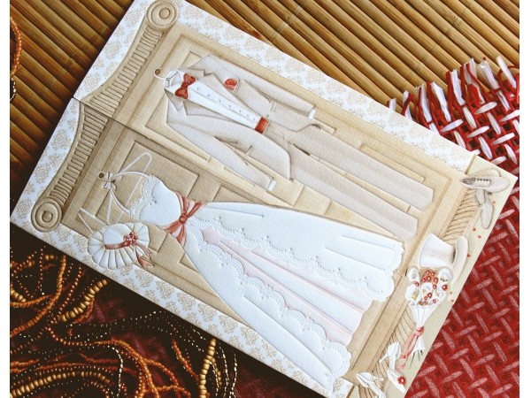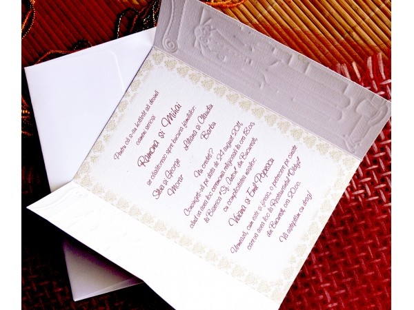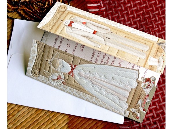 Invitatie din carton alb indoit pe orizontala in trei parti. Pe interiorul invitatiei este tiparit textul. Doua parti laterale care se unesc pe centru, formeaza fata invitatiei cu o imagine a unui dulap pe usile caruia sunt umerasele, cu rochia de mireasa aflata pe usa din stanga si umerasul cu costumul de mire pe usa din dreapta.