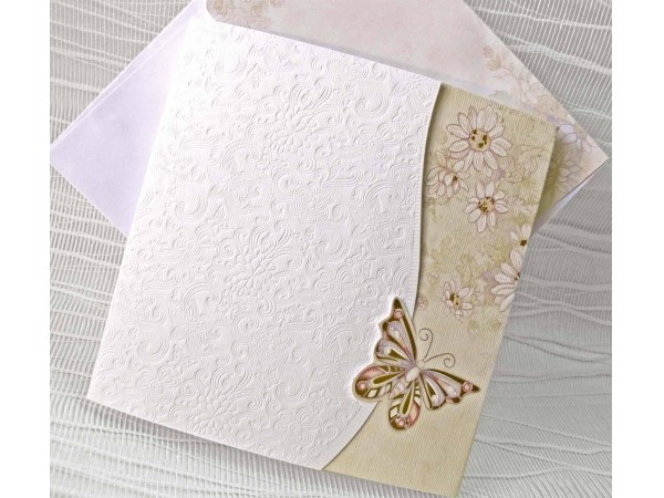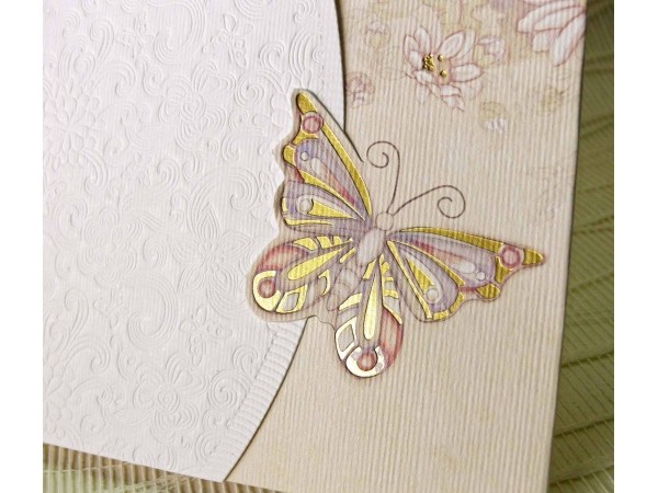 Invitatie din carton alb indoit pe orizontala in trei parti inegale. Baza formeaza marimea invitatiei, iar cele doua parti laterale formeaza fata. Fata din stanga este alba si are embosata toata suprafata cu motive florale, iar marginea din dreapta este decupata sub forma de semicerc.