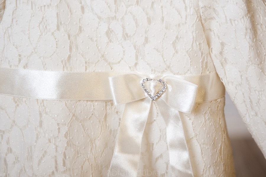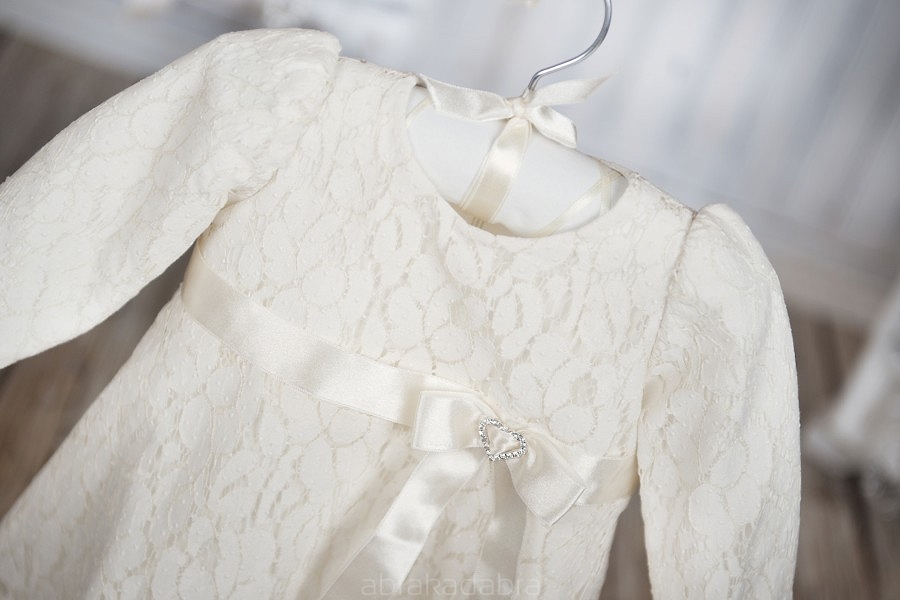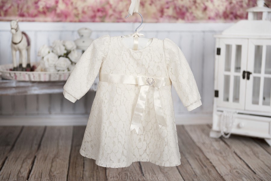 Descriere produs: O frumoasa rochita pentru botez in nuante de crem, din bumbac moale cu imprimeu la captusala, decorata cu centura din saten la talie.