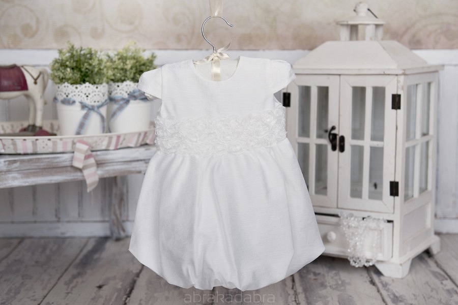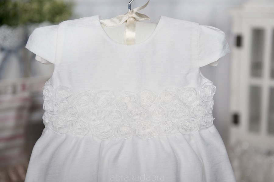 Descriere produs: Rochita alba din material lucios cu brau din trandafiri.