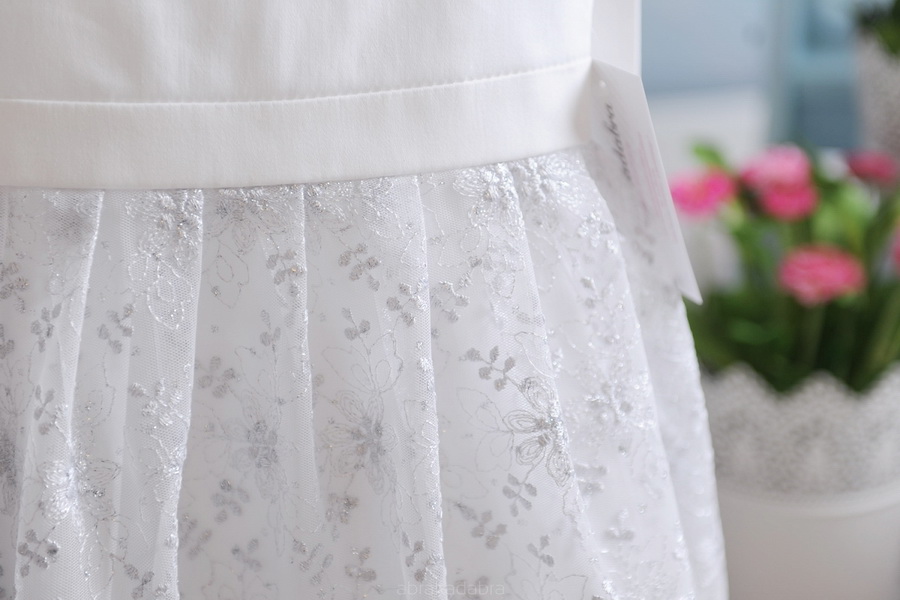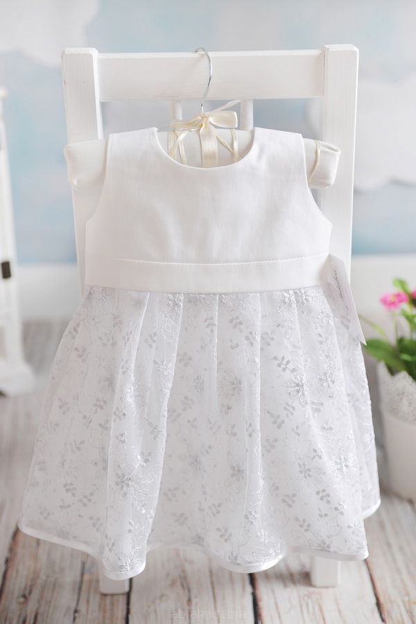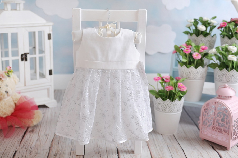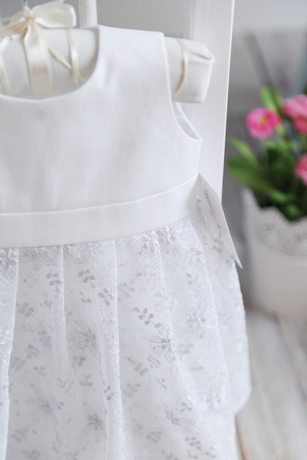 Descriere produs:Rochita pentru botez din saten fin, bumbac alb si dantela stralucitoare. Marime: 62