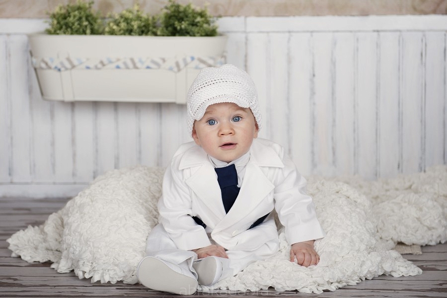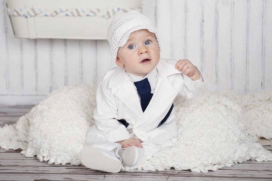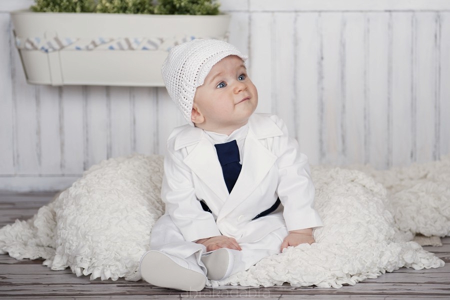 Sacou alb cu model bleumarin pe buzunare din bumbac.