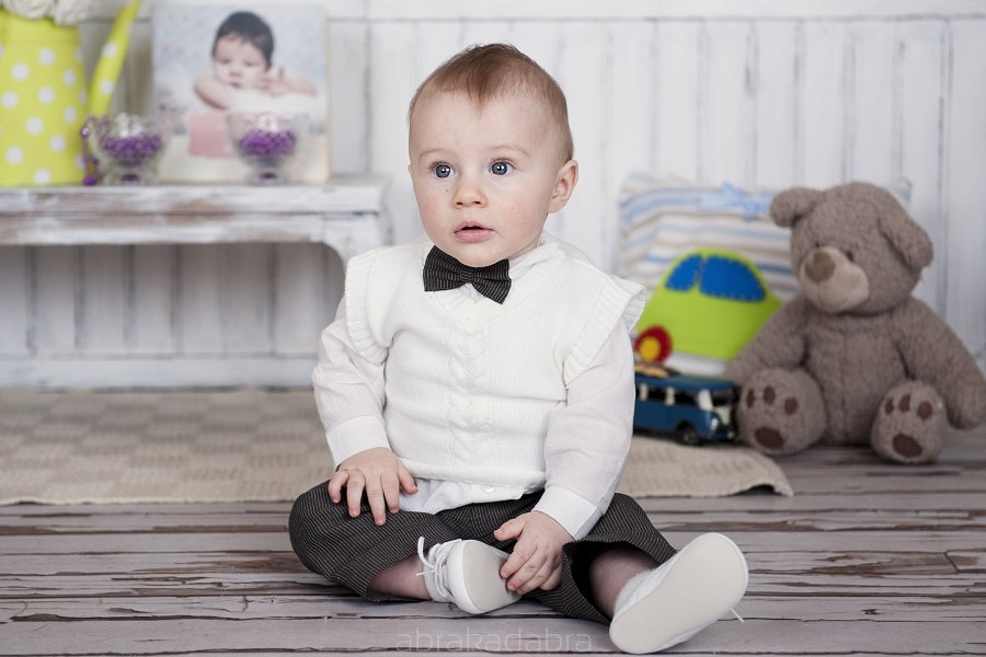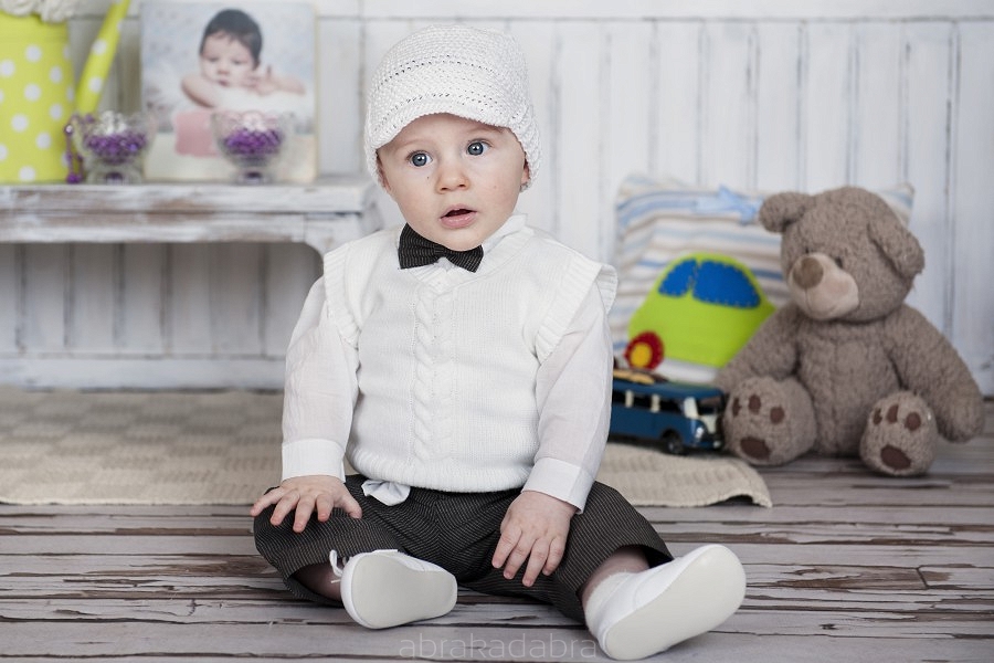Set elegant pentru botez compus din camasuta alba de bumbac, pantaloni din lana gri in dungi, vestuta alba crosetata si sepcuta alba crosetata.