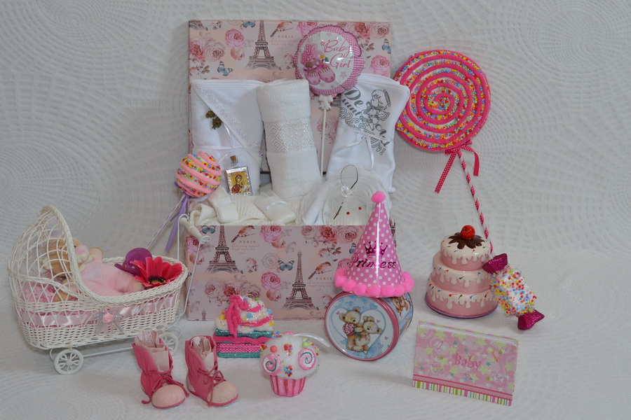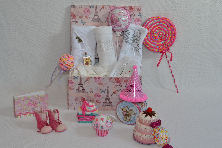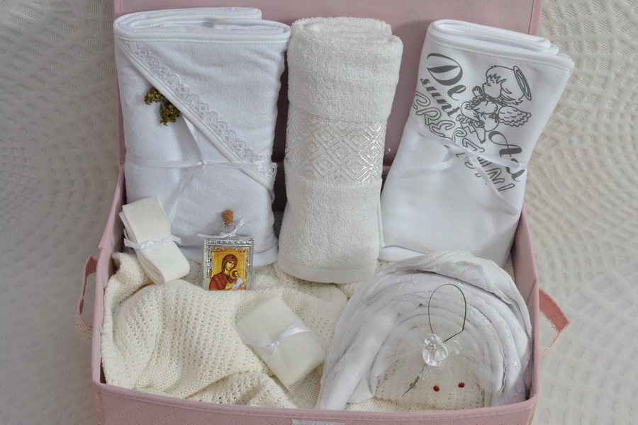Set trusou botez fetita in cutie baby pink cu manere din danteluta, motive cirese si bulinute si fundita. Cutia se poate folosii ulterior ca si spatiu de depozitare.