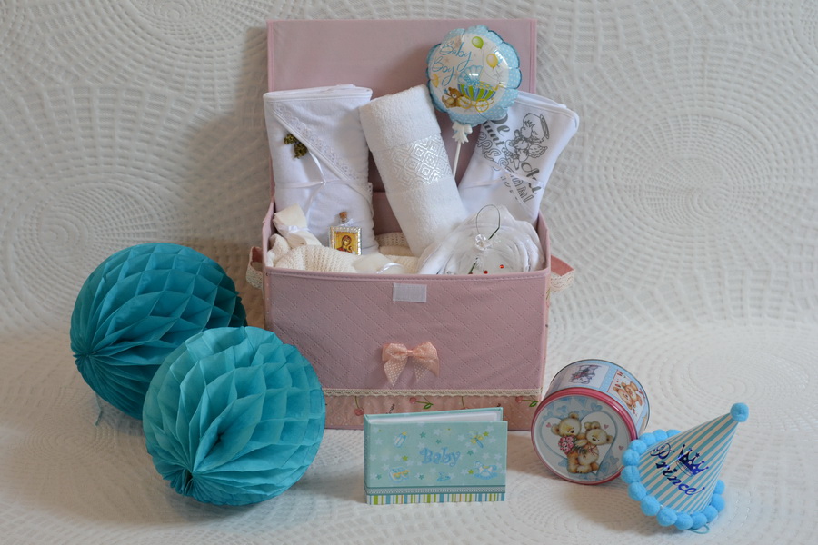 Trusoul Contine prosop preot, prosop mare cu gluga si danteluta, pled cu ingerasi, panza mir, sticluta mir, fasa, sapun.